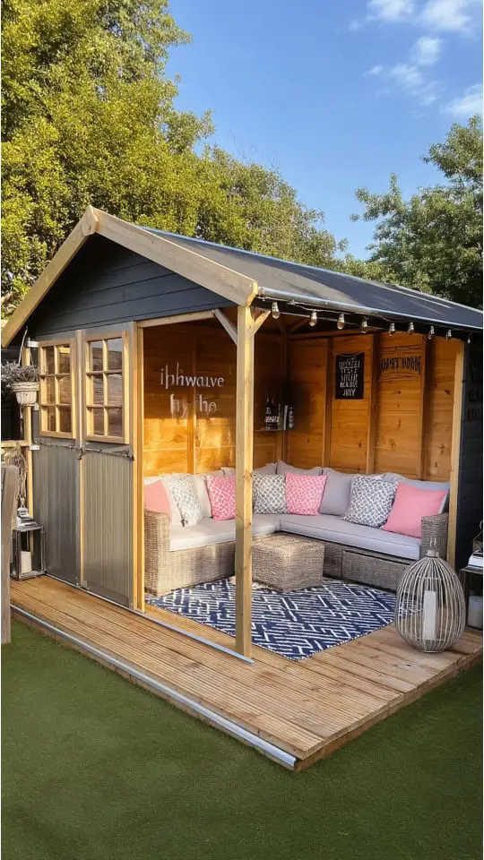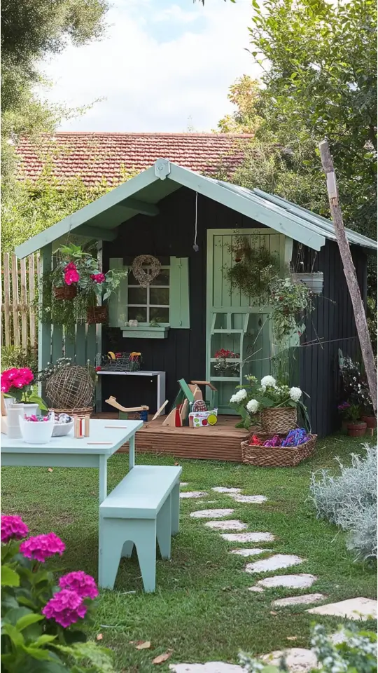 Decorating the shed transforms it completely. A few hanging flower baskets, colorful window boxes, or string lights can bring charm to the entire area.