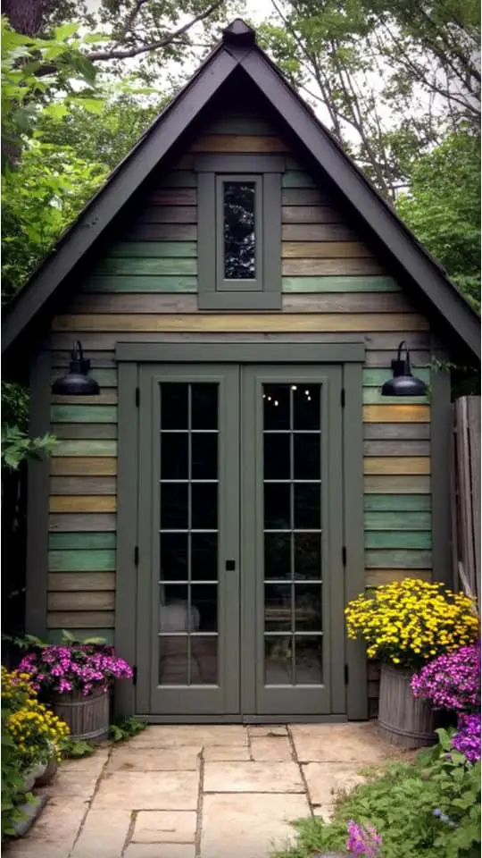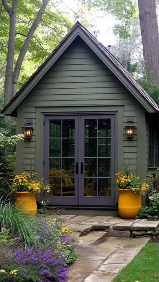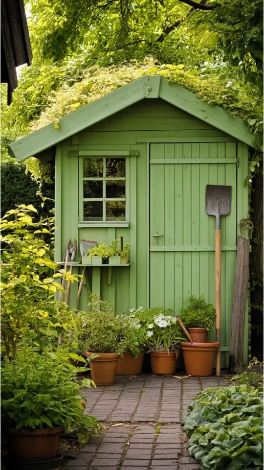 I love how a green garden shed feels alive in a lush yard. The vibrant color melts into the plants around it, making everything look natural and fresh.