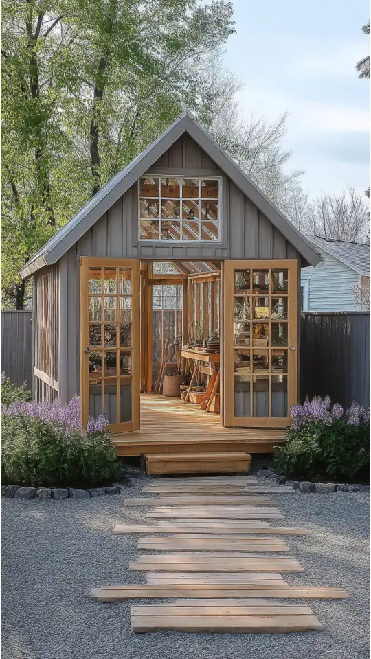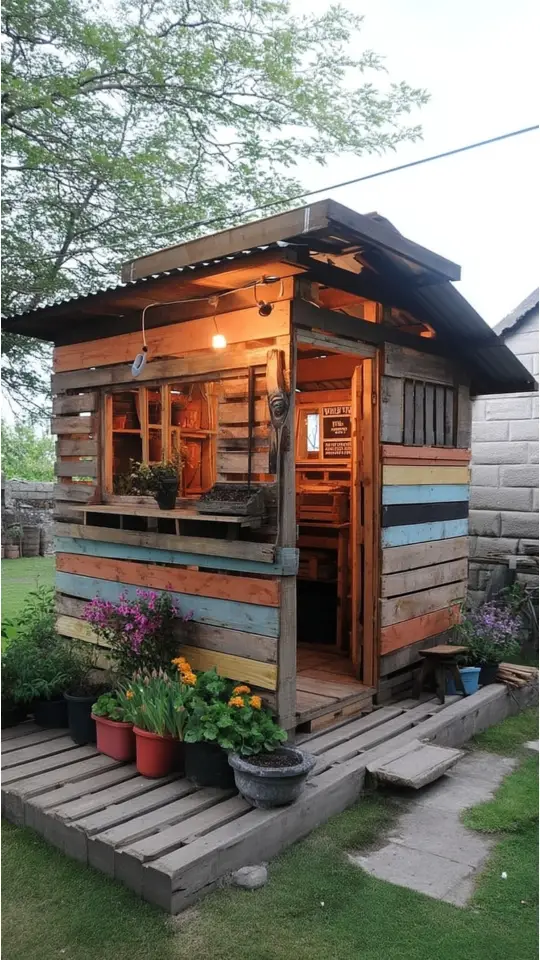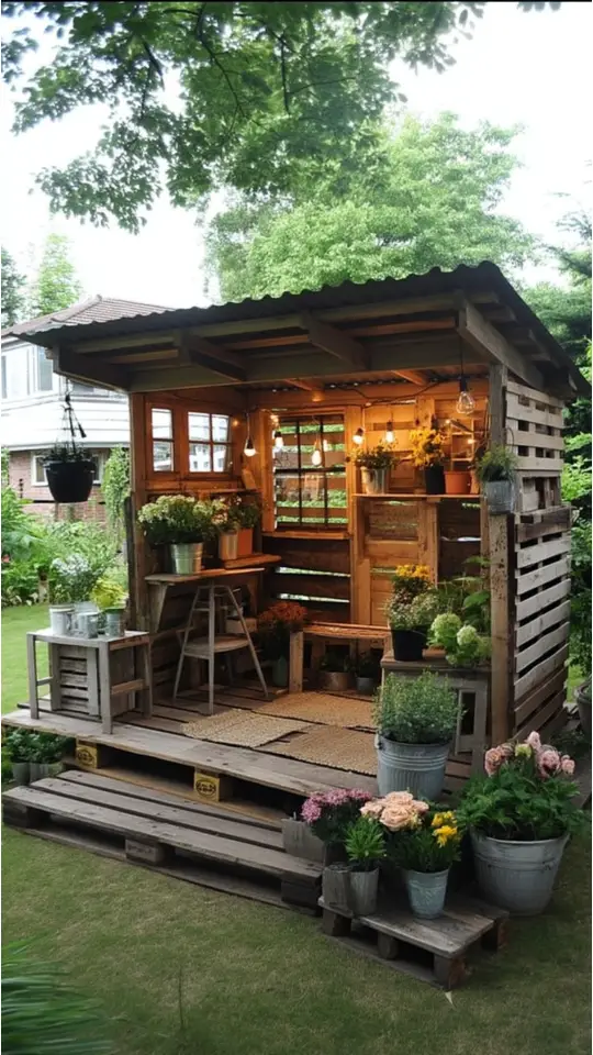 A pallet garden shed is an eco-friendly choice. Using repurposed pallets makes it sustainable and budget-friendly. The rustic look adds charm while making the space warm and inviting.