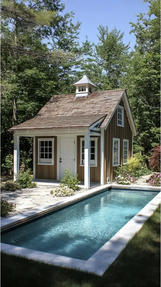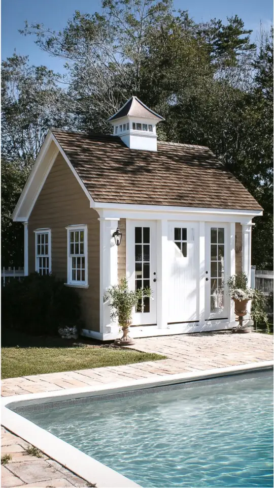A garden shed can do more than just store tools. Near a pool, it turns into a stylish pool house. I’ve seen prefab sheds with white siding and gabled roofs that add charm to any backyard.