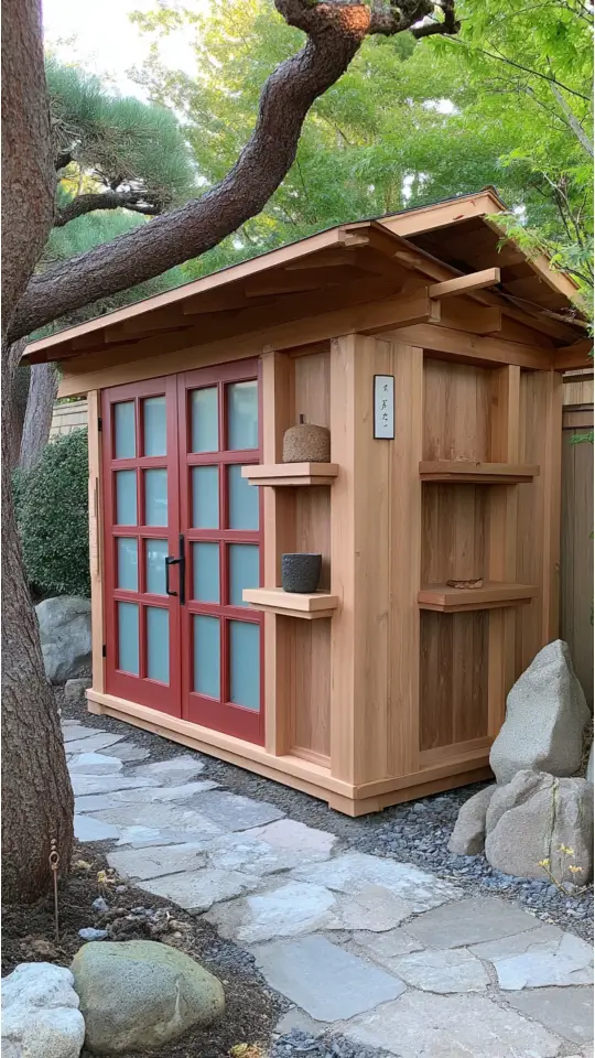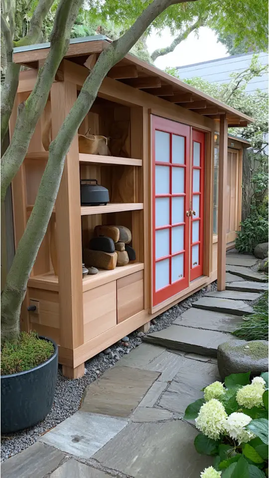 A Japanese garden shed brings calm and balance to any yard. Its minimalist look blends with nature. Wood and neutral colors create a clean, simple vibe that feels peaceful.
