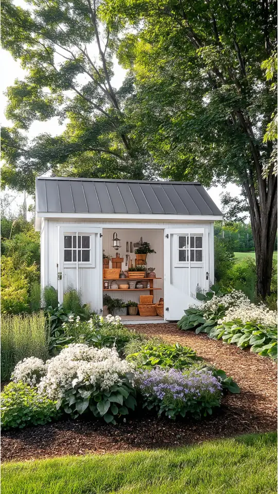 White sheds make gardens feel brighter and more open. The clean paint matches any garden style, from modern to vintage. I love how they act as a peaceful retreat on sunny days.