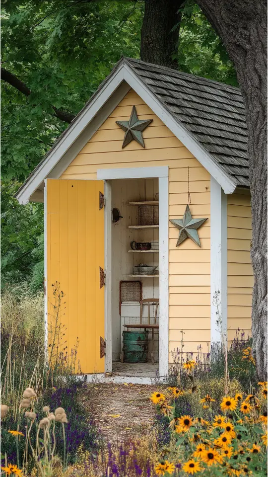 Painting the shed yellow creates a happy focal point. It blends well with flowers like sunflowers, daisies, or tulips. The design turns any yard into a welcoming space full of joy and warmth.