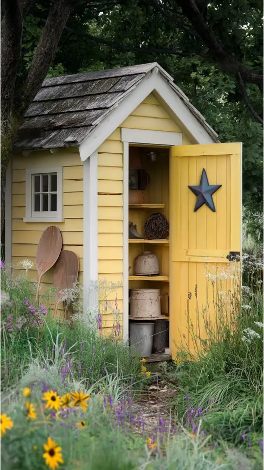A bright yellow garden shed makes the backyard feel alive. Its cheerful color stands out and adds sunshine, even on cloudy days.