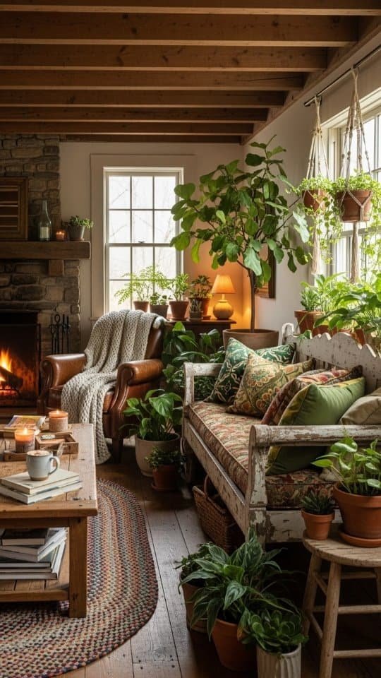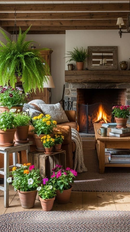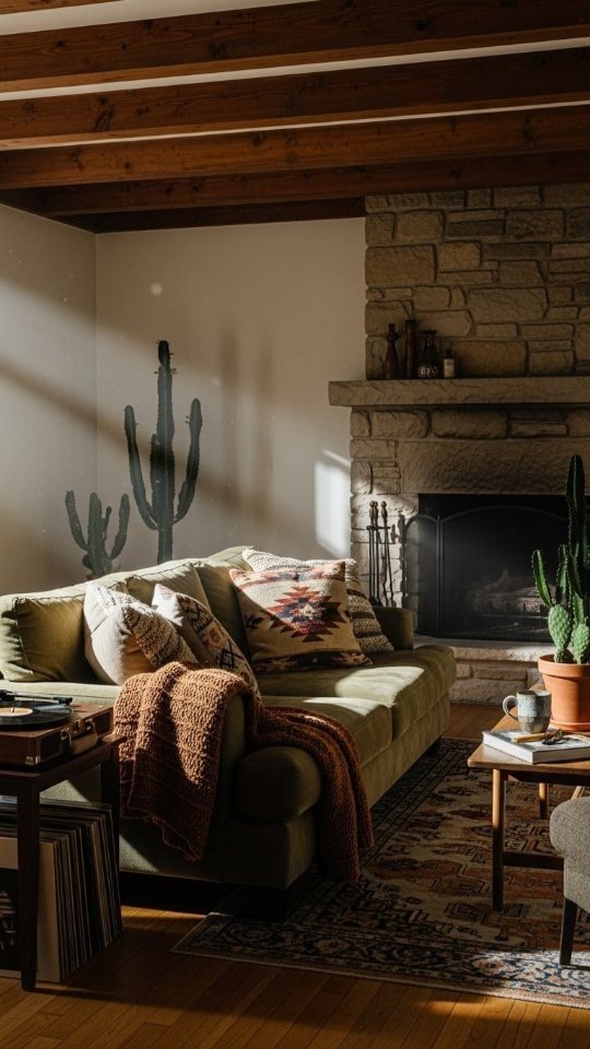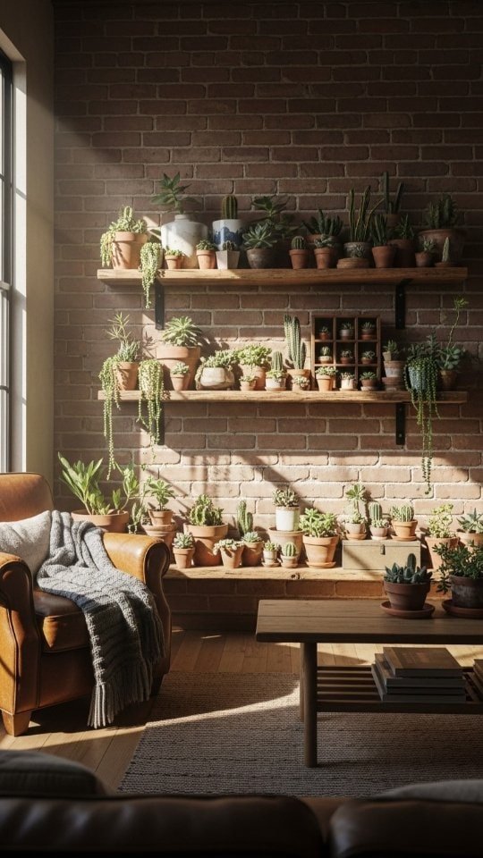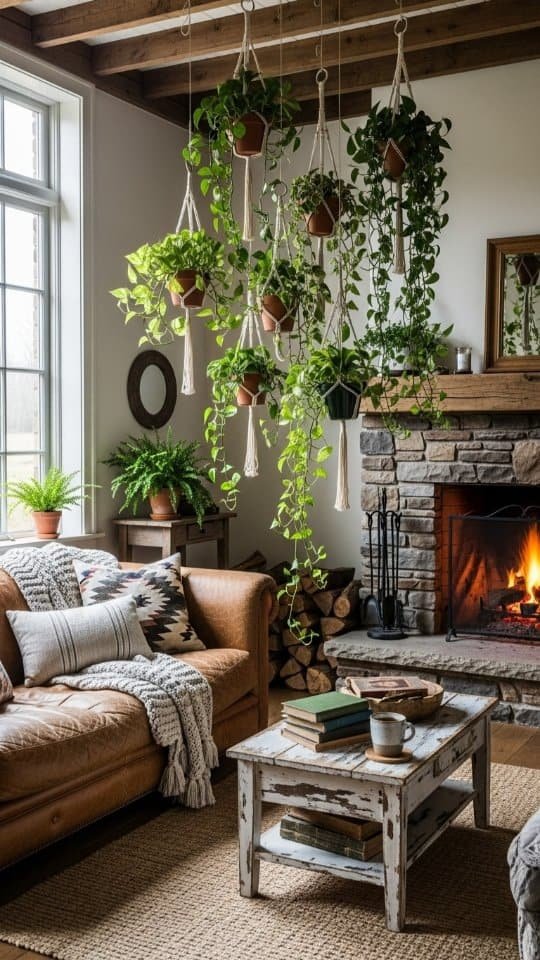 Cacti create a warm and simple space, but cascading greenery brings life to higher spots. I like using hanging plants around wooden beams or near the fireplace corner. This setup softens hard edges in the room while adding charm.