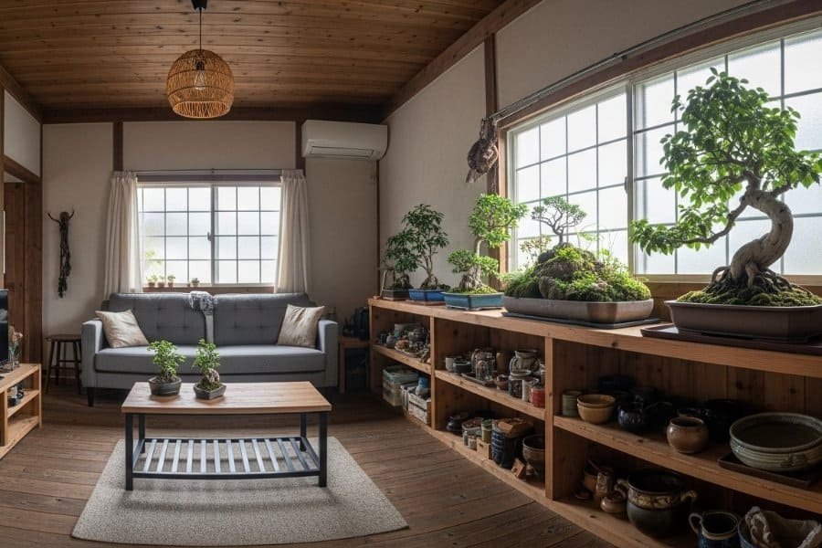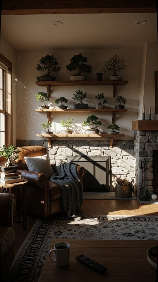 Hanging plants feel cozy, but bonsai trees bring calm. I love arranging shelved bonsai gardens near big windows. The sunlight makes them thrive, creating a tiny forest inside my home.