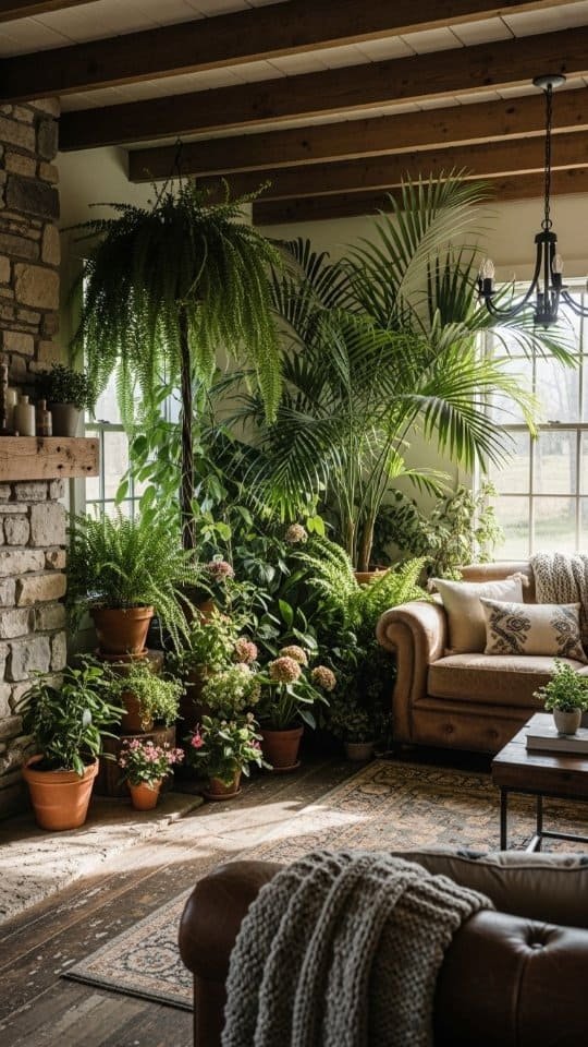 Lush palms bring life to any rustic living room. Their tall, green leaves soften hard wood and brick. I group them in corners or near windows for a natural touch.