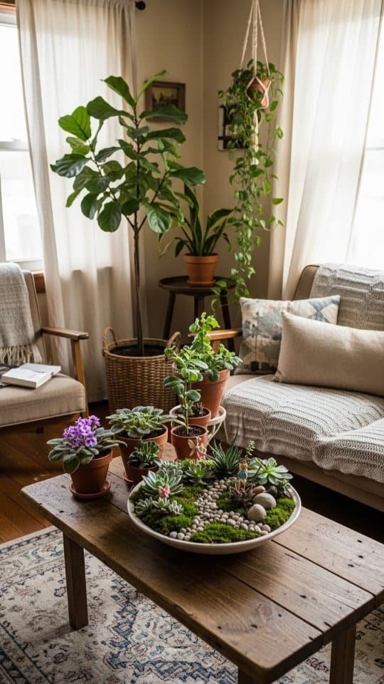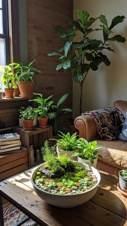 Small succulents like Aloe or Agave mix well with ferns. I enjoy arranging them between smooth stones for a natural look. This setup mimics dry landscapes but works indoors perfectly.