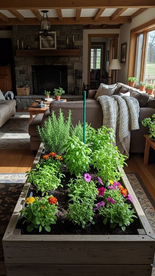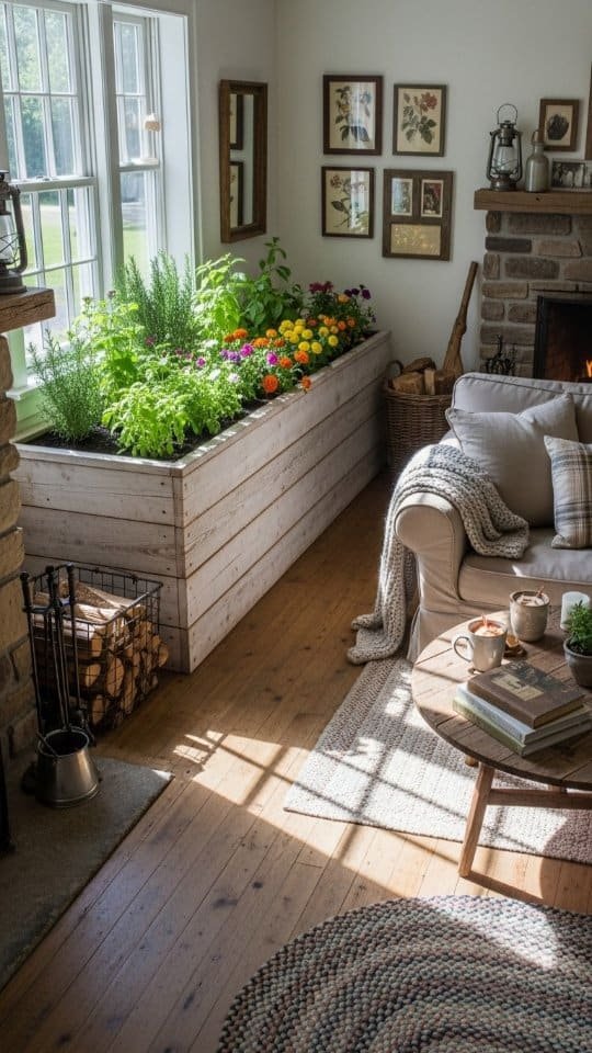 Bright pots of flowers cheer up any space, but a raised garden bed by the fireplace adds charm and warmth. I enjoy building these beds to keep herbs close for cooking.