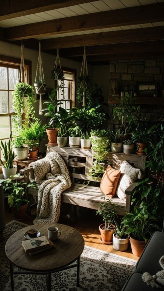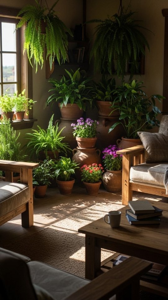 The greenery boosts calmness while soft light adds warmth to the space. Sitting here feels like an indoor retreat from daily stress! Adding some potted ferns or leafy vines can really elevate it further.
