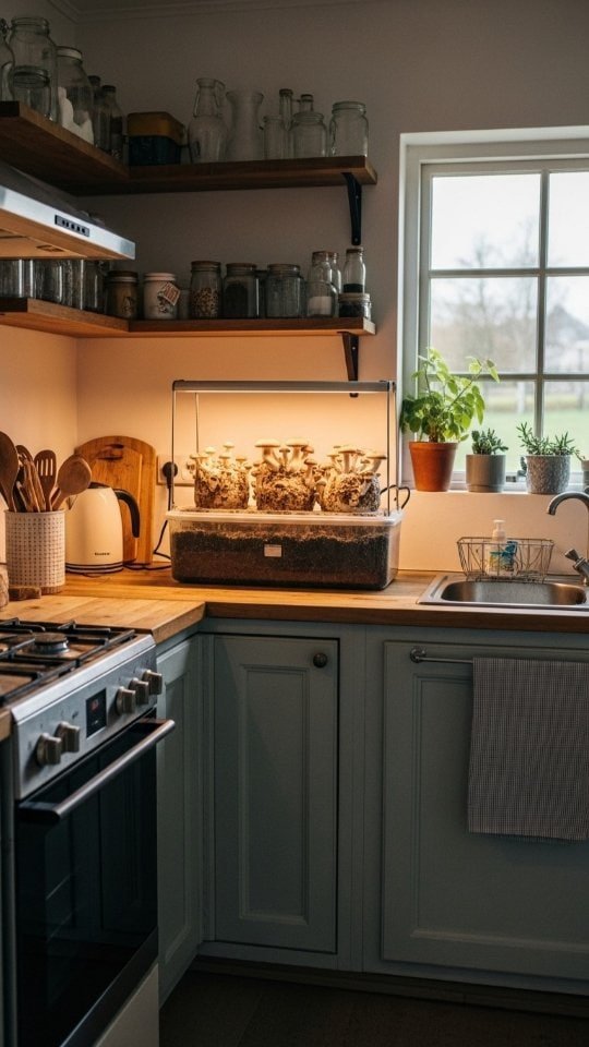Next, let’s talk about growing mushrooms indoors for a rustic kitchen vibe….