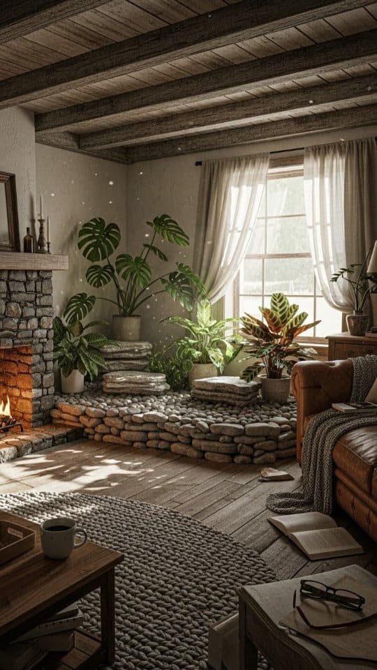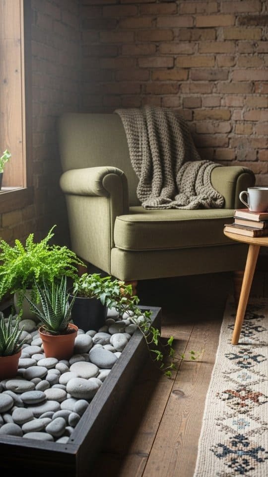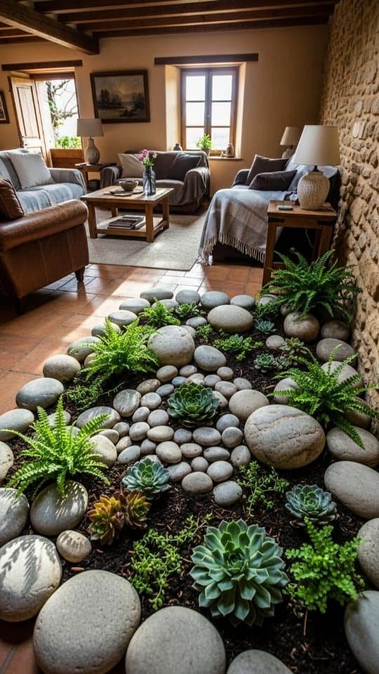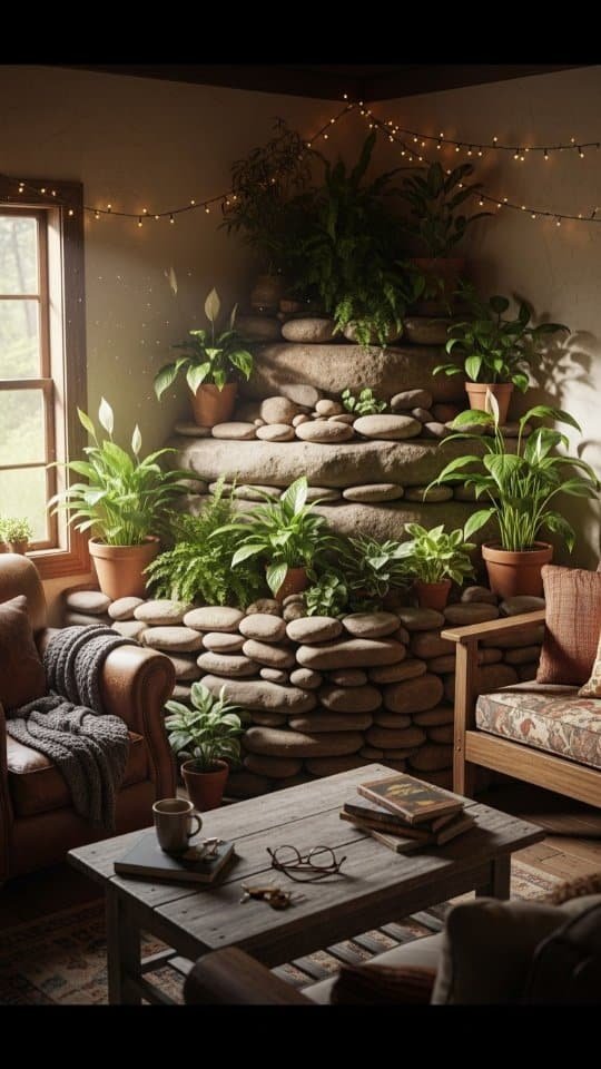 I love how a tiered stone wall creates a natural indoor retreat. Stacking stones at different levels adds depth and charm. Plants like ferns, succulents, and moss fill the gaps perfectly.
