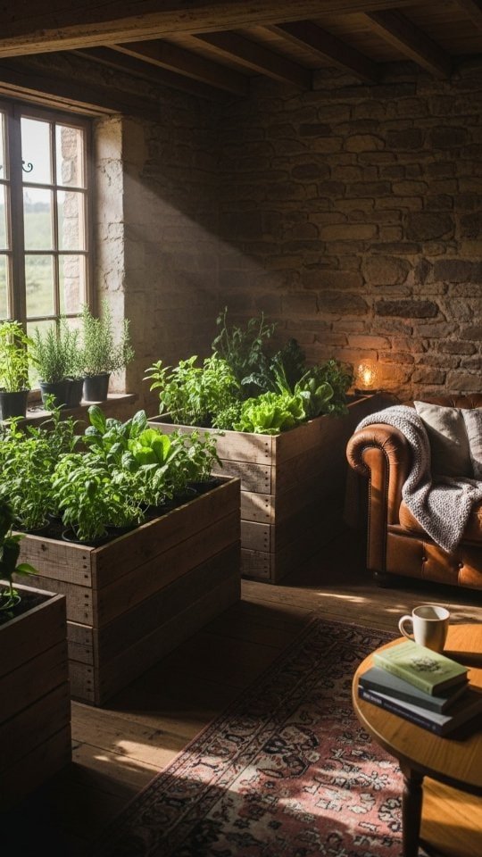 Ferns and pebbles feel smooth and modern. Raised garden beds bring a rustic warmth inside. I use wooden boxes for growing leafy greens like spinach or kale.