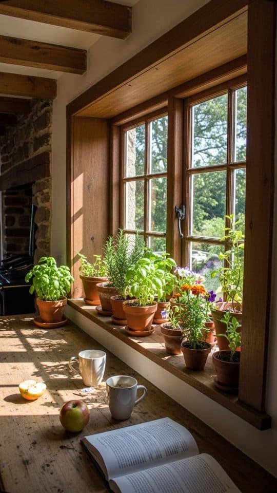I grow herbs on my kitchen windowsill. Fresh basil, parsley, and thyme sit in small pots by the sunlight. These add flavor to meals and brighten my space with green leaves.
