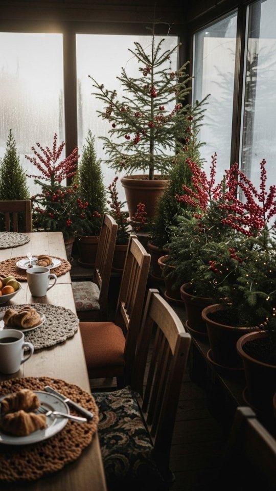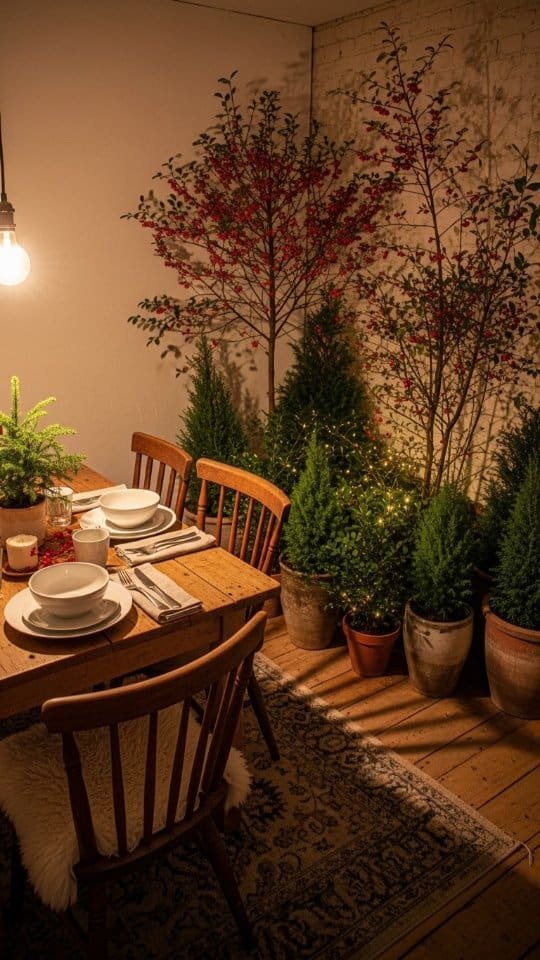 I like using potted evergreens and faux berries for a cozy, festive touch. A few spruce arrangements in small containers can brighten up my dining table.