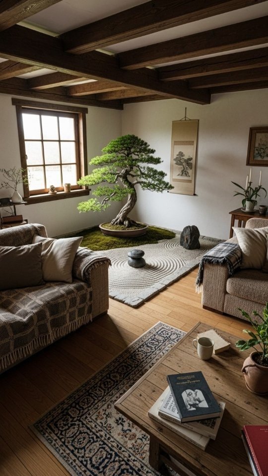 A Zen garden feels calming, but a Japanese indoor garden adds elegance too. A bonsai tree surrounded by raked sand creates a peaceful centerpiece.