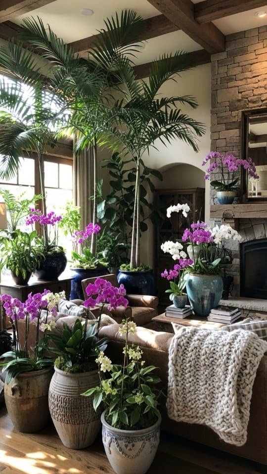 Moving from the calm vibes of a Japanese garden, I like creating grand indoor spaces with palms and orchids. These plants feel lush and bring elegance. Large pots make them stand out even more.