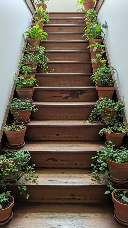 Terracotta pots make indoor stairs feel alive. I line my staircase with plants like ferns, succulents, and trailing vines. Cascading greenery adds charm as it spills down the sides.