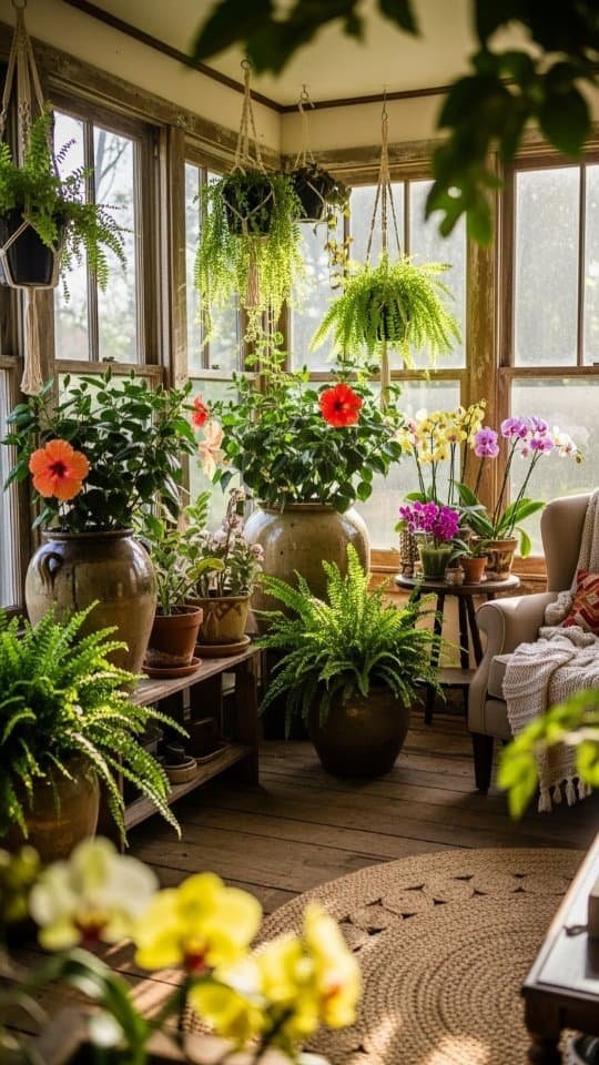 Bright orchids and lush palms create joyful spaces. Next, I enjoy crafting a fairy garden to bring magic indoors.