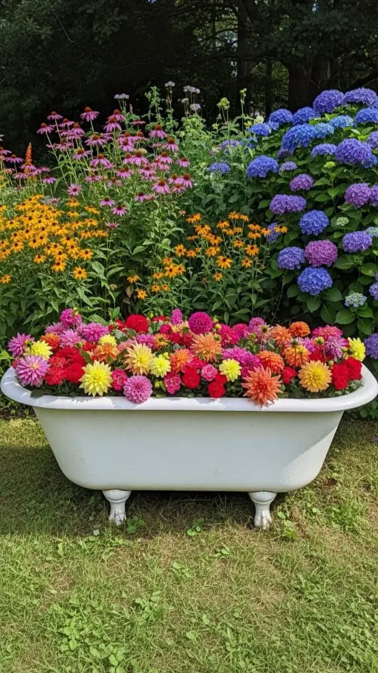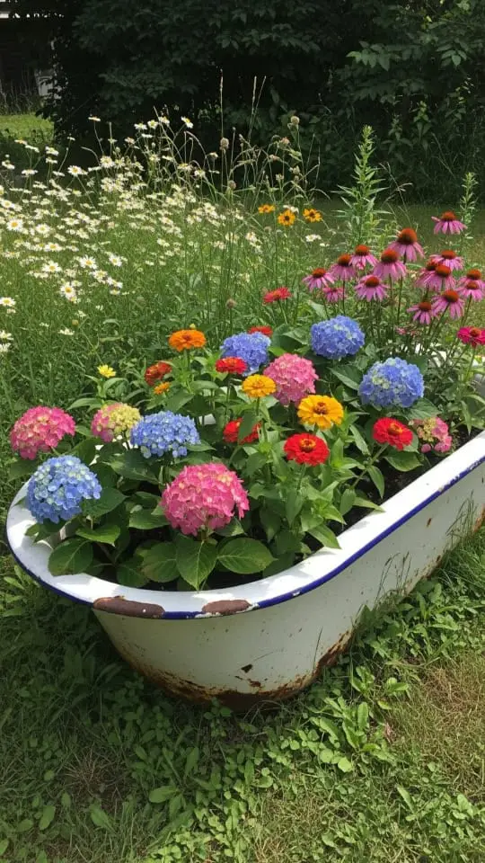 I turned an old bathtub into a flower bed last summer. It now overflows with colorful blooms, making my garden pop. Bright tulips and cheerful marigolds spill over the sides.