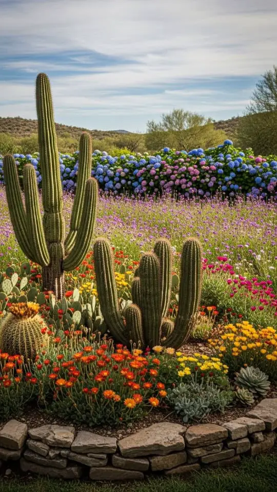 That old boat bursting with life reminds me of another bold choice—a cactus flower bed. I pair desert cacti with bright, cheerful blooms for a stunning look.
