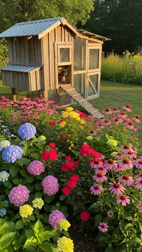 I framed my chicken coop with hydrangeas and coneflowers. Their blooms added color and charm to the space. The flowers also provided shade for the chickens on sunny days.