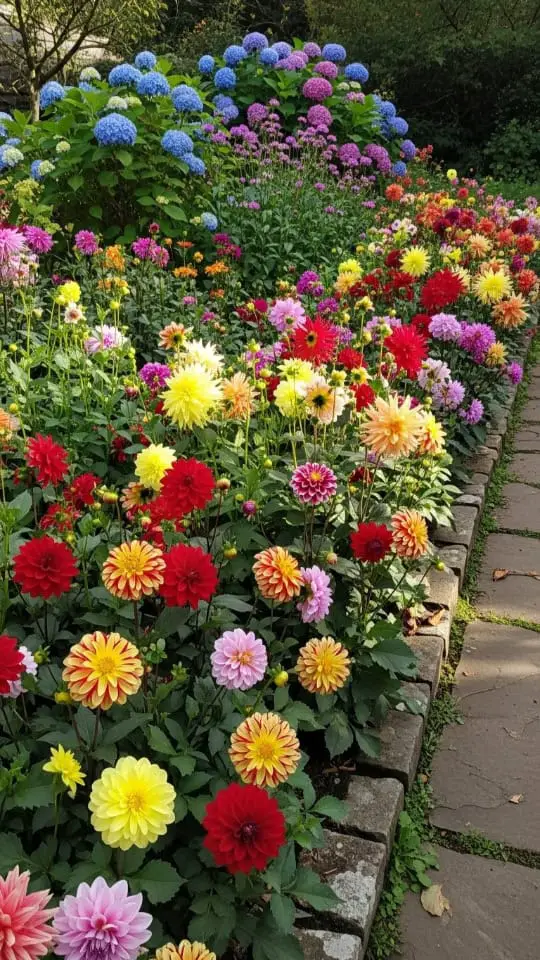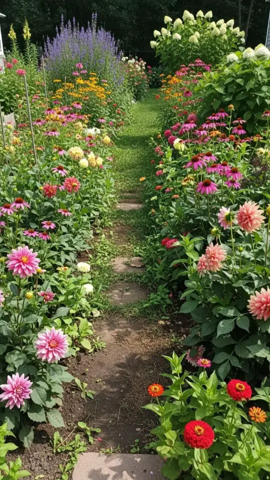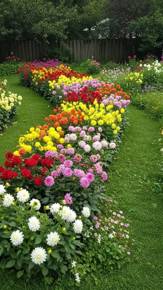 Bright rows of dahlias can make any garden path look stunning. I love how their bold colors, like red, pink, and yellow, grab attention.
