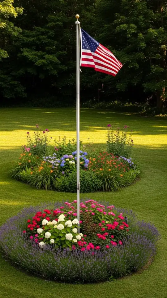 These beds are perfect for Memorial Day or Independence Day celebrations. The flagpole stands tall as the centerpiece, while the flowers create bold patterns below it.