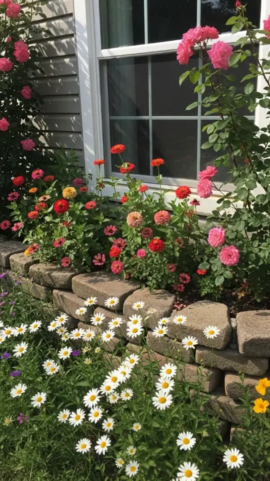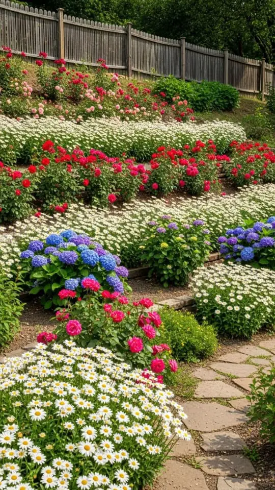 Stone walls create tidy layers, but hillsides offer a chance for beauty too. I love planting daisies and roses in tiers on slopes. These flowers make a hillside glow with color and order.