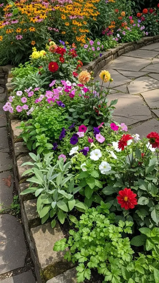 Fresh herbs like basil, rosemary, and thyme thrive alongside bright petunias. This mix fills the air with an amazing scent as I walk by.