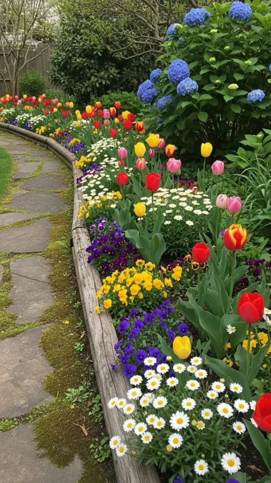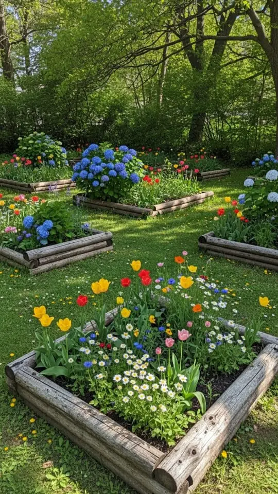 Rustic log borders give flower beds a natural, cozy look. I love using them to keep tulips and hydrangeas neatly framed.