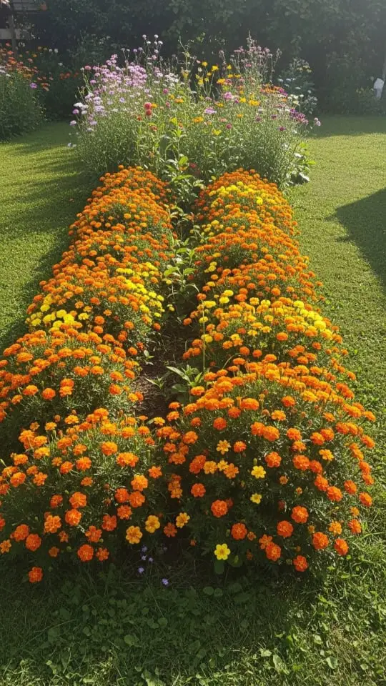 Golden marigolds bloom brightly from spring through fall. I love how their warm colors—yellow, orange, and red—light up any path or border. These flowers do more than look pretty; they attract butterflies and keep pests away.