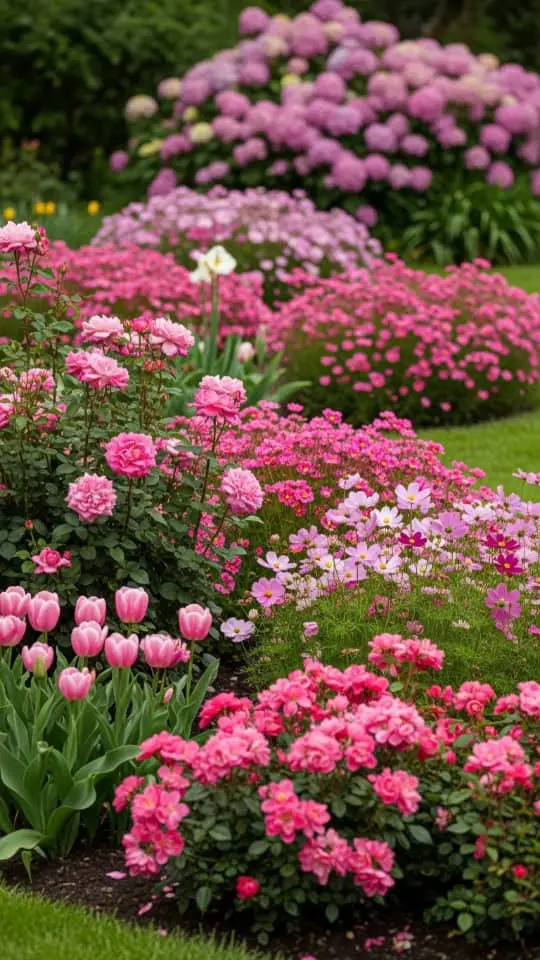 Pink roses and tulips create a dreamy garden full of love. These flowers brighten both front and back yards with soft charm. Pink blooms feel perfect for special occasions, like Mother’s Day.