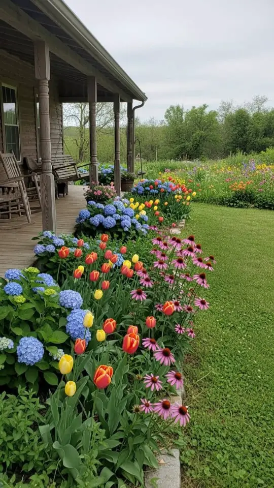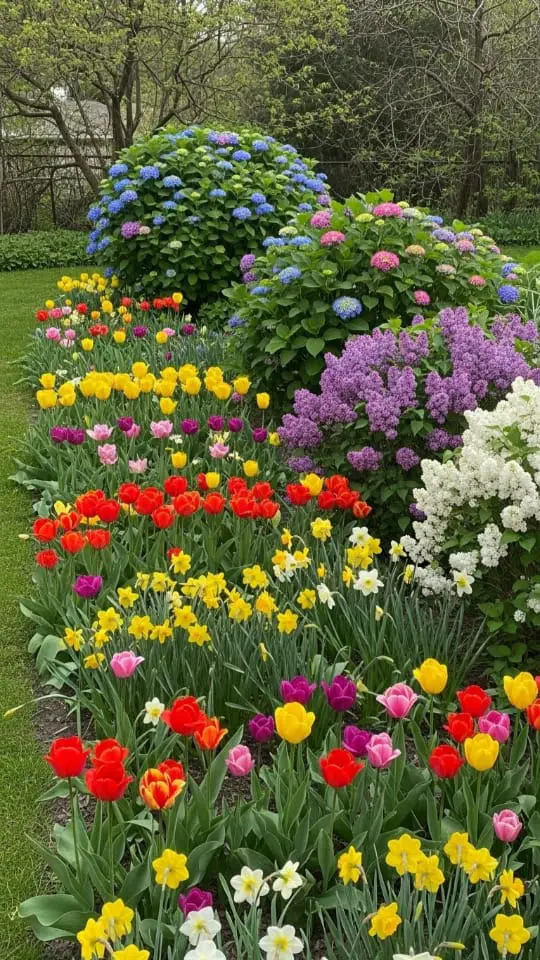Hydrangeas and tulips bring life to a sunny window frame. Their colors brighten cottage-style homes. I like how these flower beds add charm and boost curb appeal instantly.