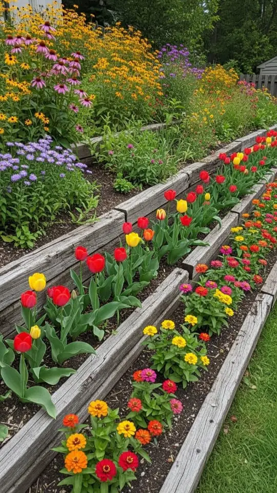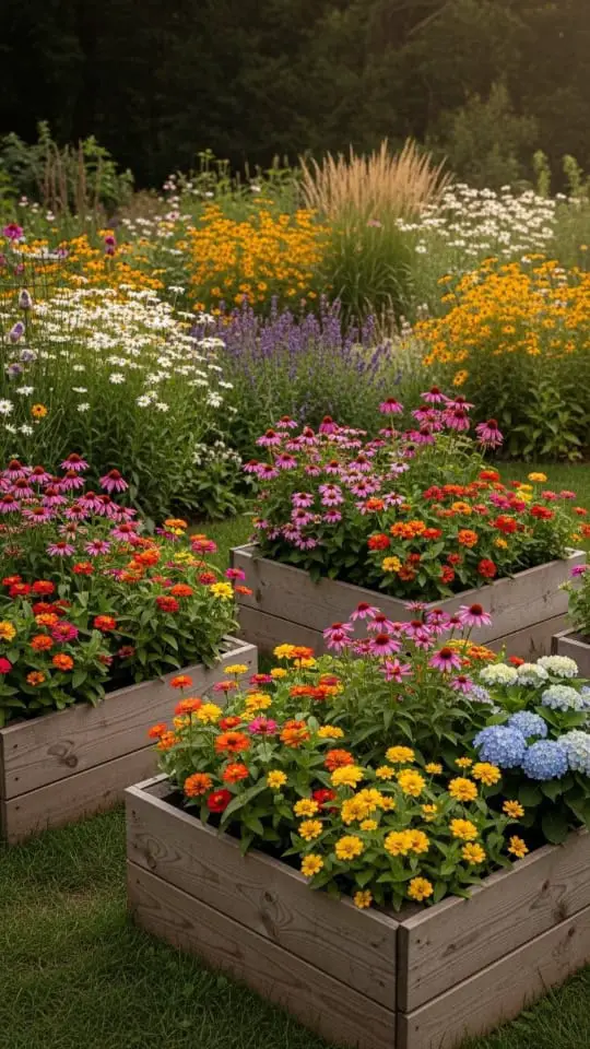 I love using raised wooden flower beds in my garden. They make planting easy and keep my back safe from strain. Zinnias grow well in them, adding cheerful colors to the yard.