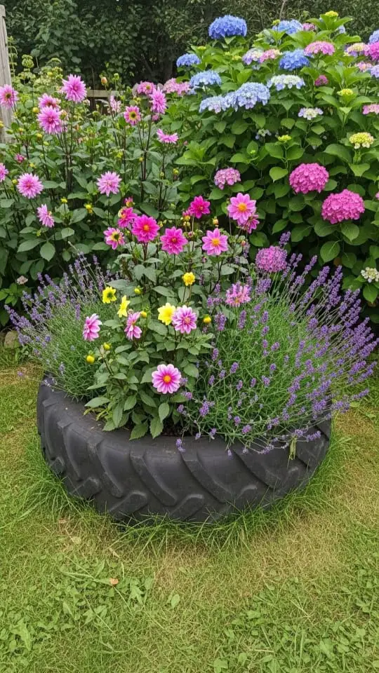Old tractor tires make unique and useful planters. I like how they keep things neat while adding height to a flower bed. Dahlias bring bright colors, and lavender adds a lovely scent.