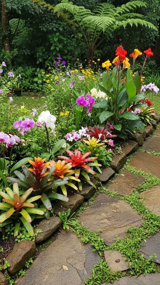 Tulips in a triangle bed catch the eye, but tropical flowers create a whole new vibe. Orchids with bright petals and bromeliads with bold leaves make any garden feel like a resort escape.