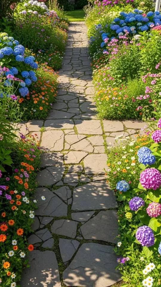 The stone walkway gives structure while guiding visitors through the flowers. It feels balanced, not too perfect, just like gardens should be.