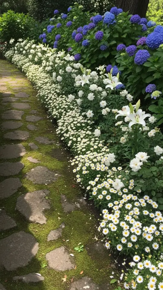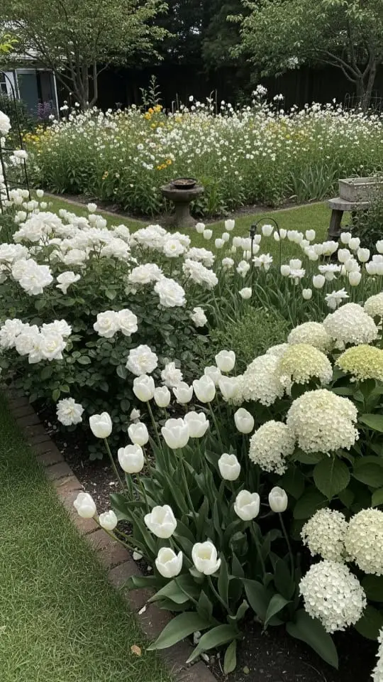 The calm beauty of a walkway flower bed flows perfectly into a white flower bed. White roses, tulips, and hydrangeas fill the garden with charm. I use white blooms to create a peaceful spot.