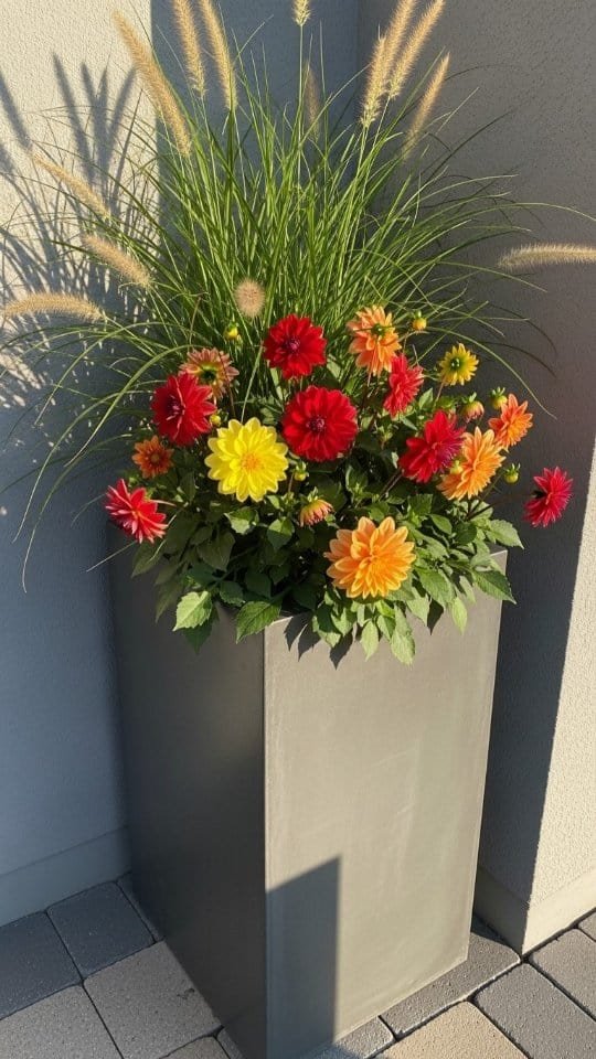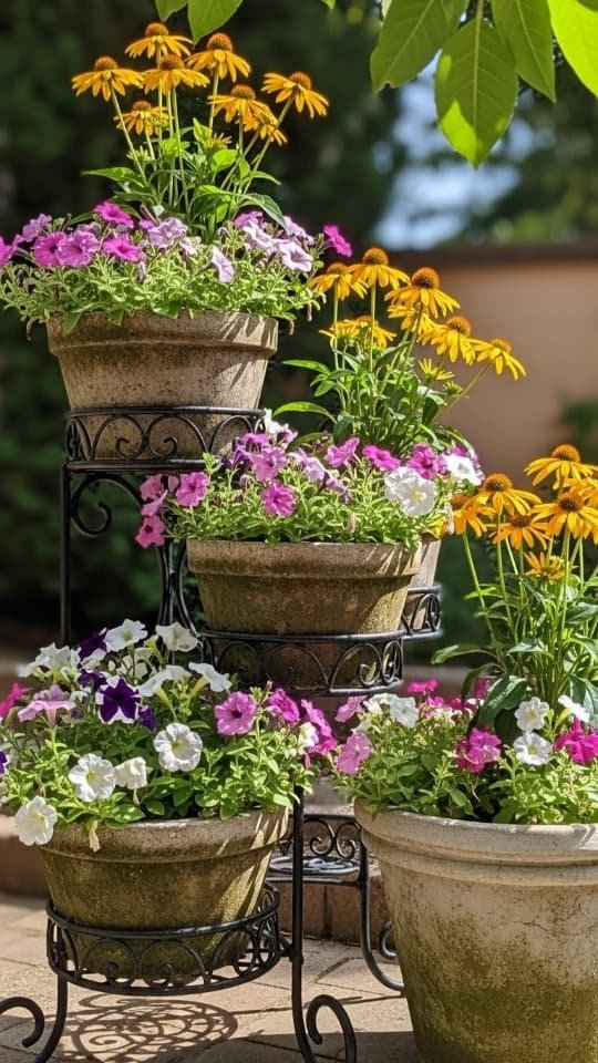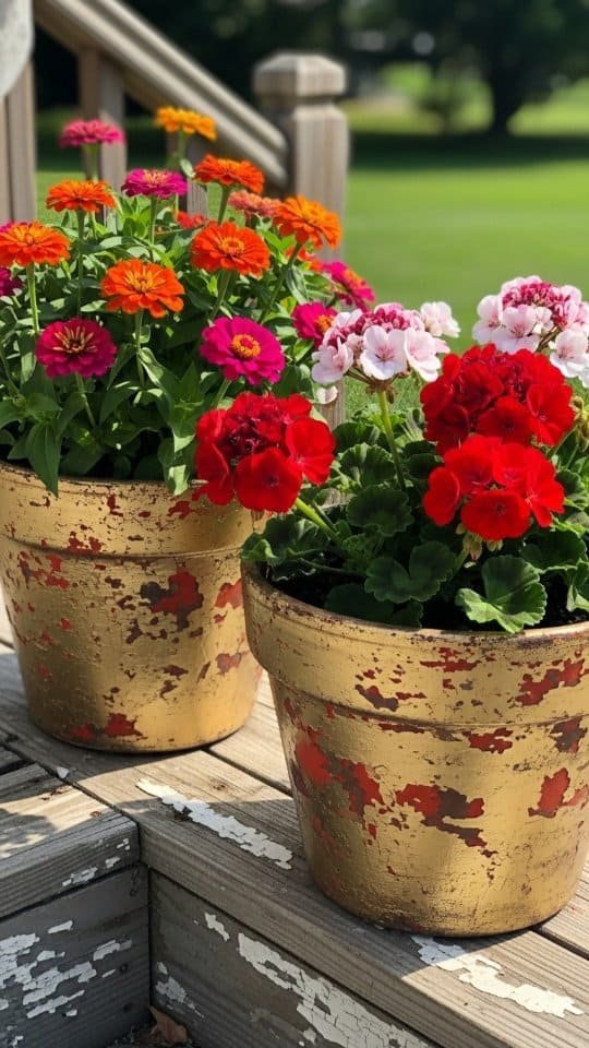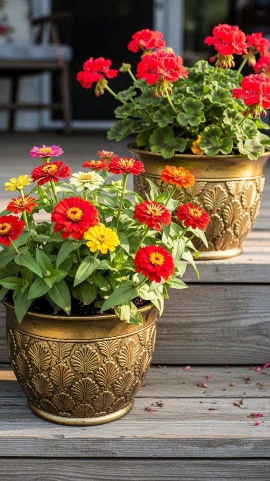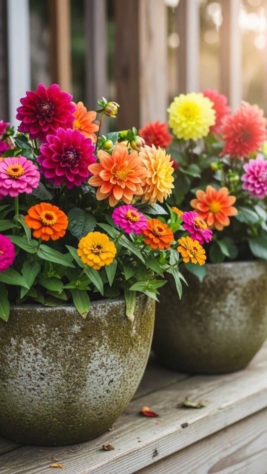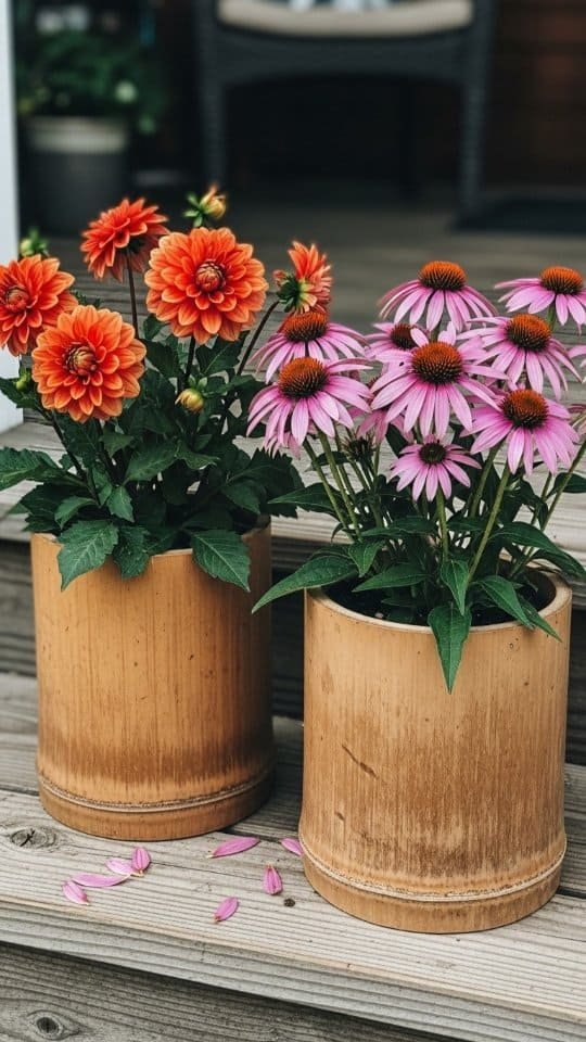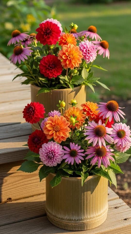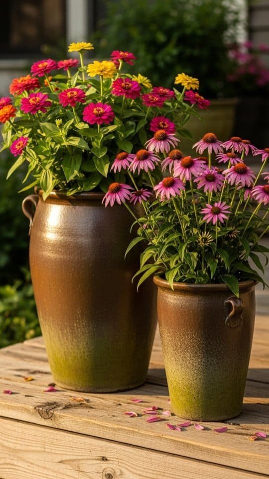 Tall ceramic pots make flowers stand out. I love using them for zinnias and coneflowers. These flowers need at least six hours of sunlight daily to thrive. Their bright colors pop in the golden light, attracting bees and butterflies.