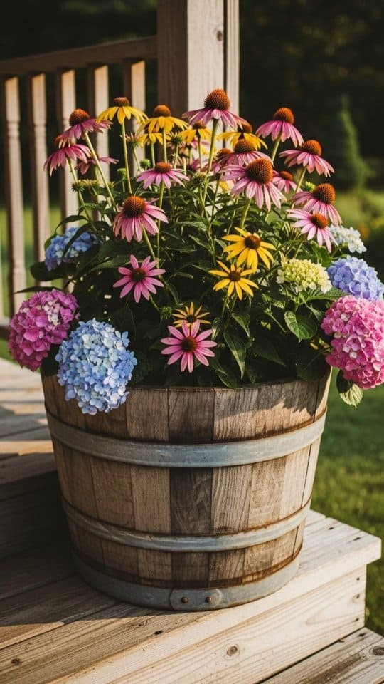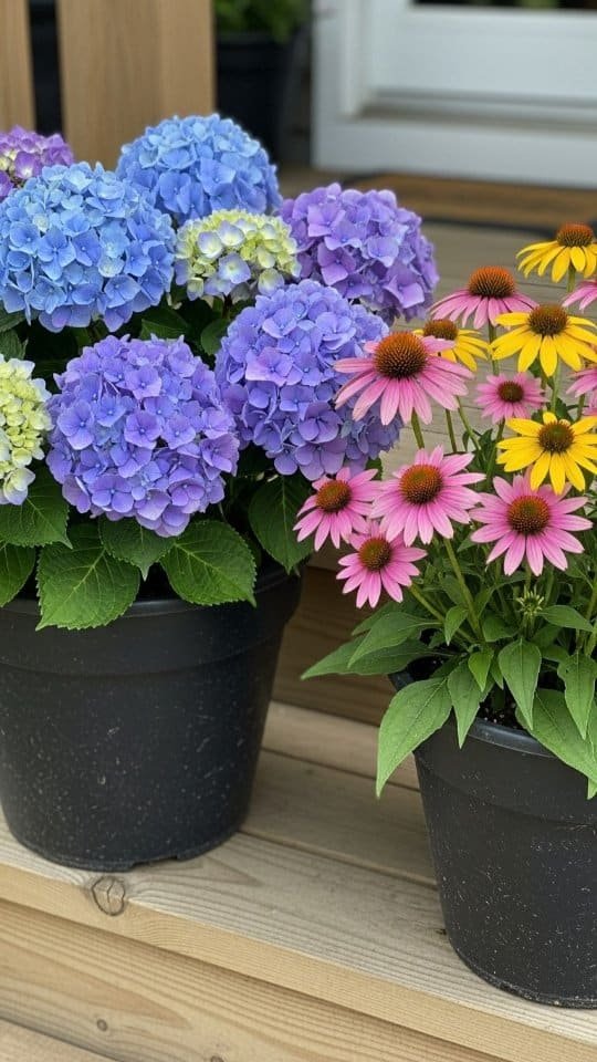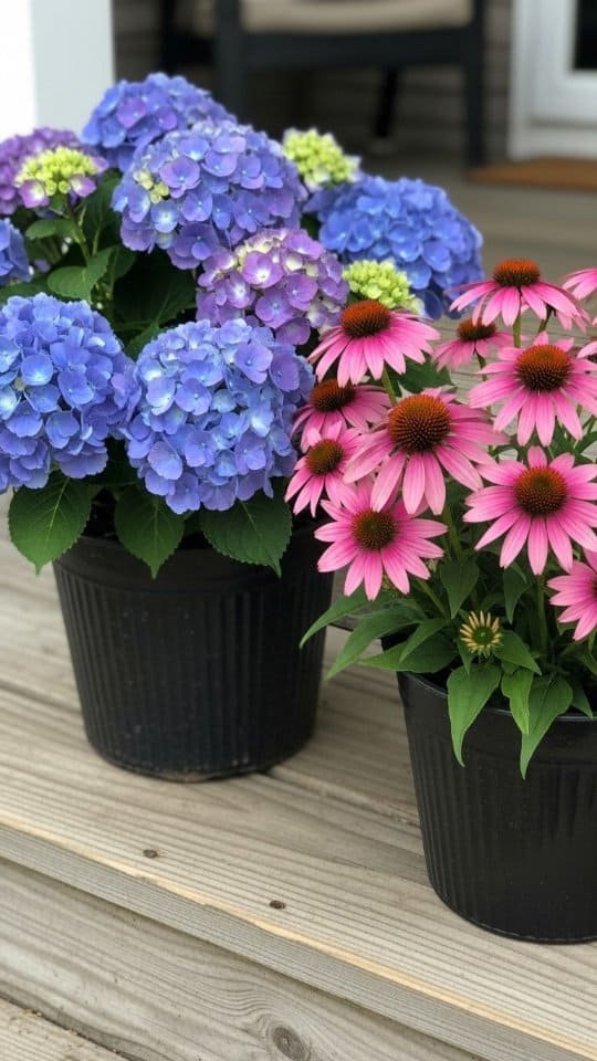 Good drainage is key for these pots. Coneflowers and hydrangeas thrive with proper care, filling the space with vibrant colors.