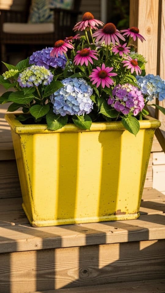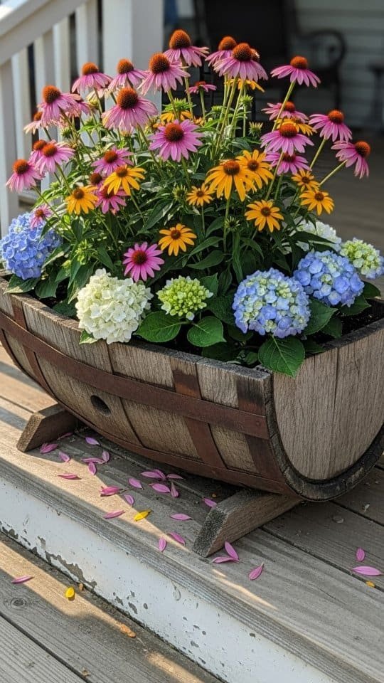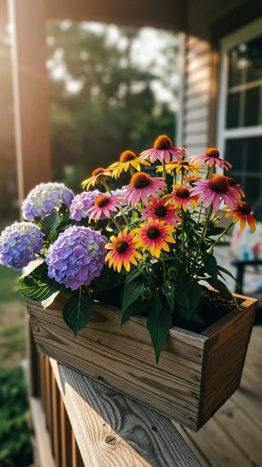 A wooden rectangle planter adds a rustic touch to patios or gardens. I like pairing tall coneflowers at the back and shorter hydrangeas in front for balance.