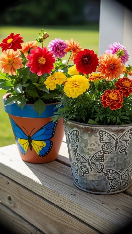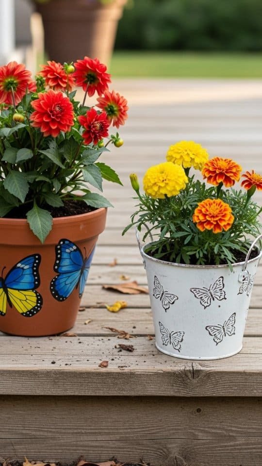 Butterfly-shaped flower pots bring charm to wooden steps. I love how they brighten up outdoor spaces.