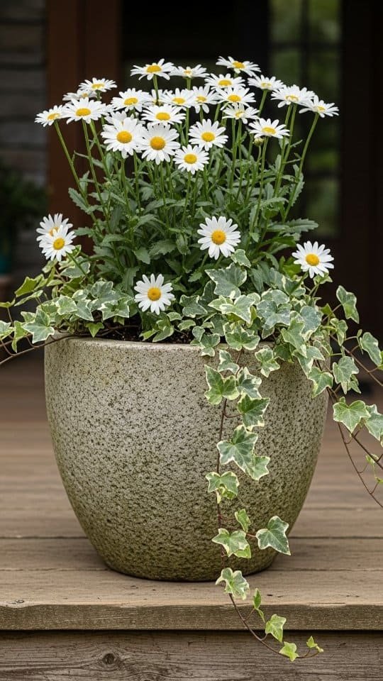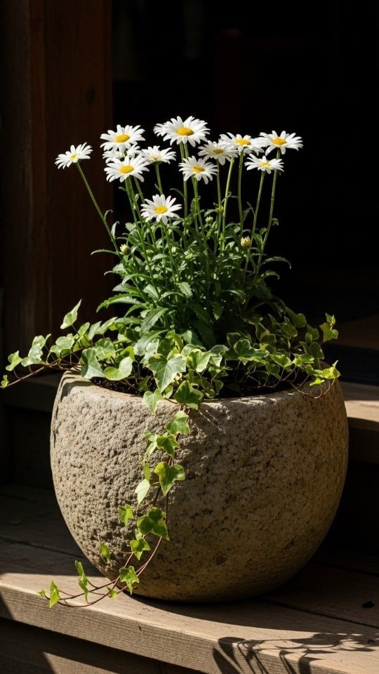 The rough texture of the pot adds to its appeal. It gives the arrangement a natural look that works well in container gardens. Daisies bring cheer, while ivy trails beautifully over the edges.