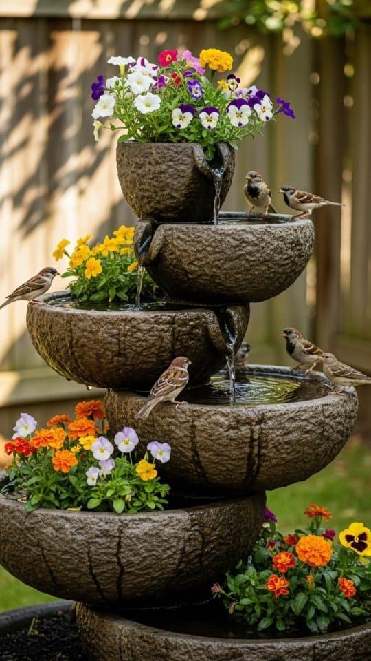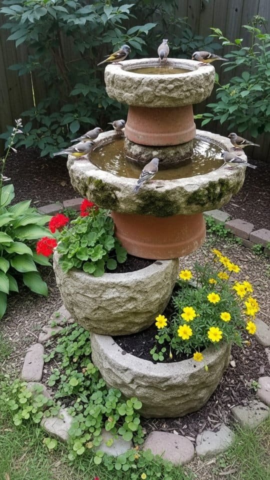 Fall flowers bring warmth, but tiered stone planters add charm and fun for birds. I once made a DIY bird bath with terracotta pots, rebar, spray paint primer, and an old light globe.