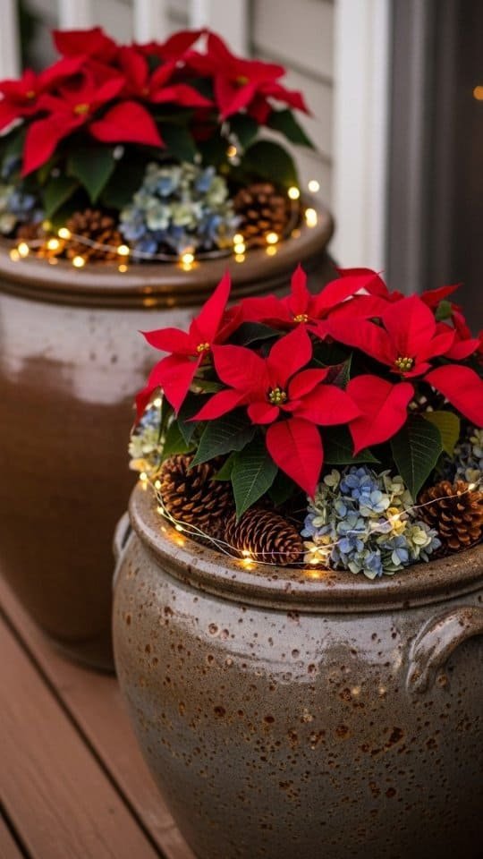 Tiered flower pots catch my eye each time, but holiday planters steal the show in winter. Bright poinsettias fill outdoor containers with vibrant red and green colors.