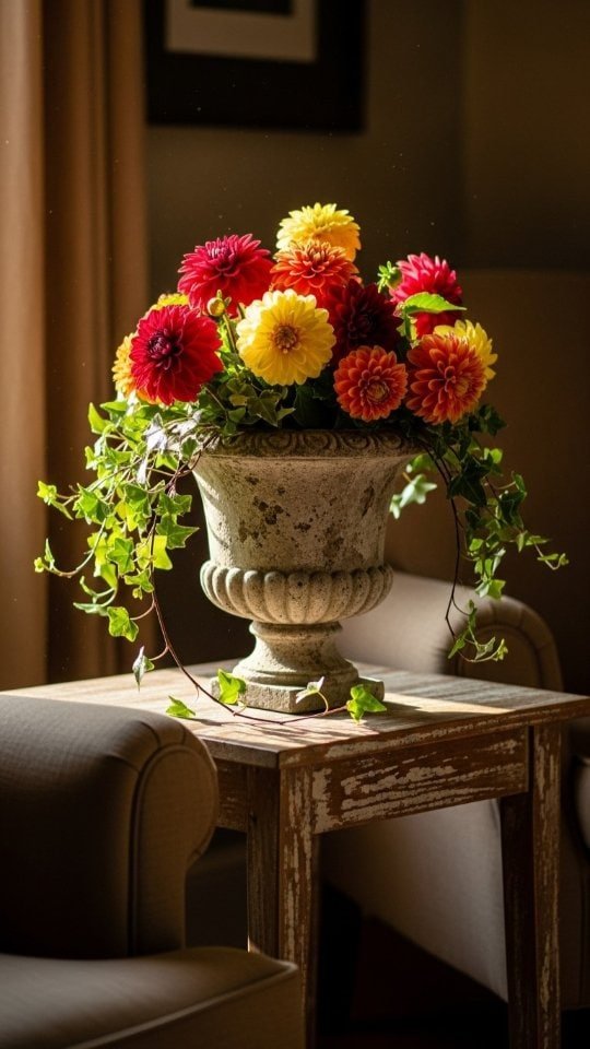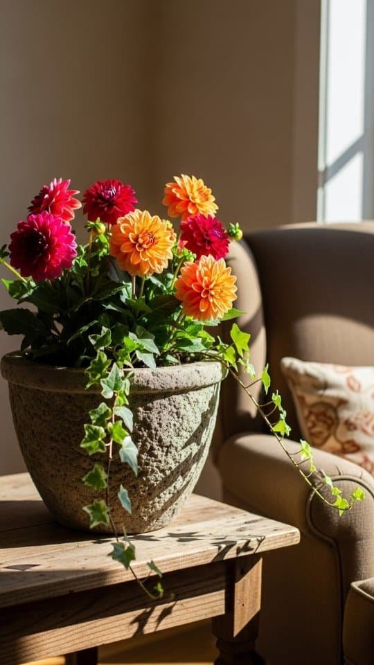 Outdoor holiday decorations may shine, but indoor charm matters too. A rustic pot filled with bright dahlias instantly livens up any living room. I like using dwarf dahlia varieties because they fit well in smaller spaces.