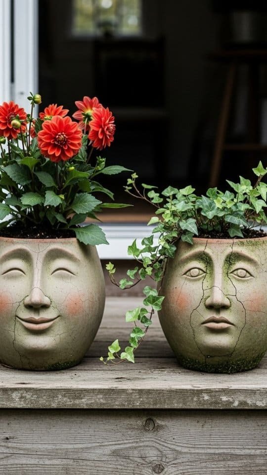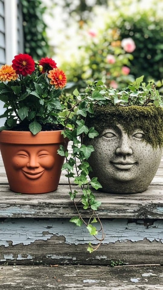 Face pots with playful designs catch the eye easily. I love how greenery and blooming flowers spill out of them, giving each pot a lively personality.