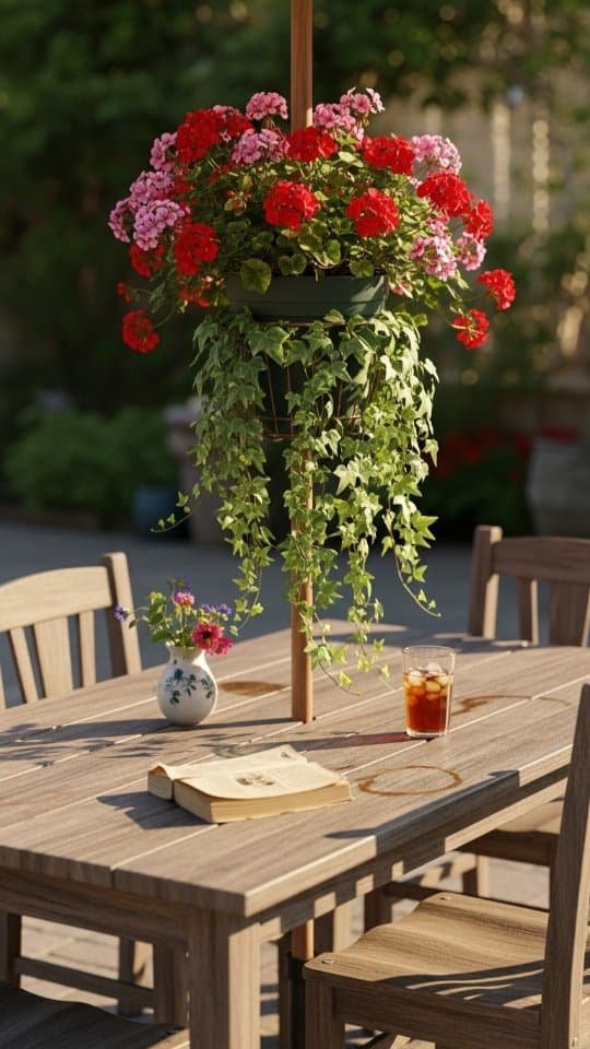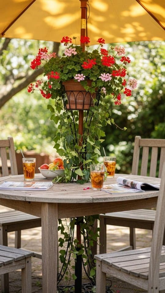 Magellan Mix Zinnias and Camara Carlos Lantana flowed around the edges, creating layers of blooms. The design kept space for cranking the umbrella without messing with plants.