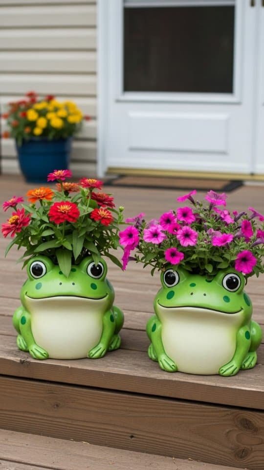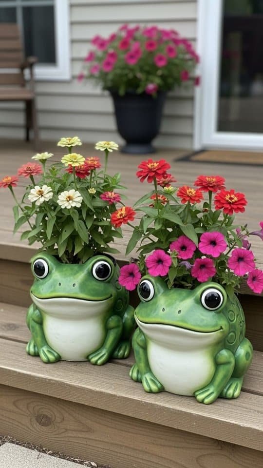 Frog-shaped pots filled with zinnias add charm to porch steps.